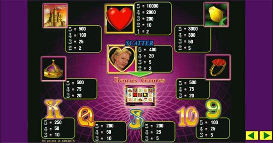 Игровой автомат Queen of Hearts – это пять барабанов и девять выигрышных линий. Независимо от Ваших желаний всегда вращается пять барабанов, а вот количество линий можно выбрать самостоятельно с помощью кнопки Line. Игра ведется жетонами номиналом в 0.10, 0.20, 0.50, 1, 2, 5 или 10 условных единиц. Размер ставки варьируется от 1 до 100 жетонов. Установите кнопкой Bet необходимую ставку или нажимайте на Max Bet (игра на максимальной ставке). Чтобы сердца и любовные символы начали кружиться в танце, нажимайте на клавишу Spin.